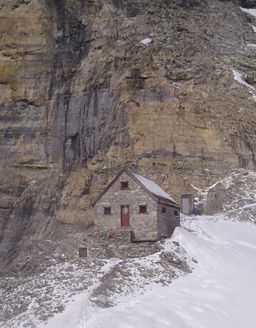 Leaving the lower levels of the glacier, we then had to climb the snow and ice mountainside, involving the very exhausting cutting of steps where necessary, and eventually reached the hut at the head of the pass with great relief!